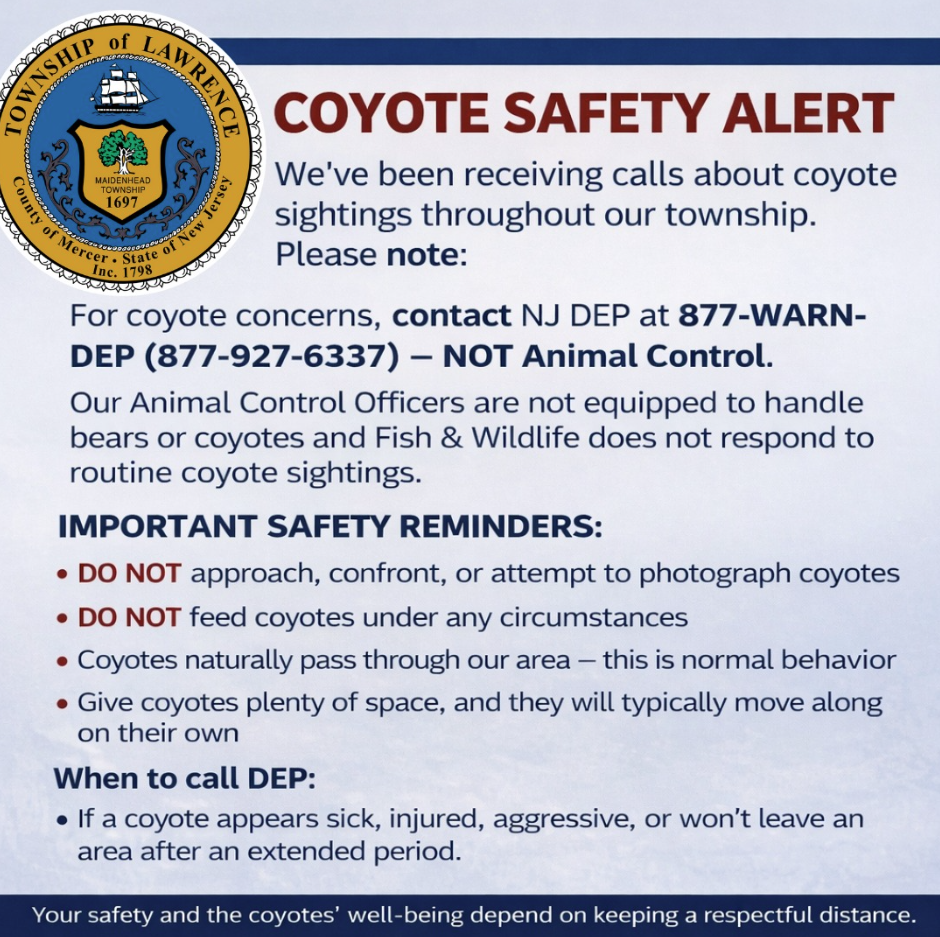 There have been reports of coyote sightings around the township. Please note: for any coyote or fox concerns, contact NJ DEP at 877-WARN-DEP (877-927-6337) - not Animal Control. Seeing coyotes and foxes in the area, especially this time of year, is normal behavior.